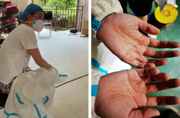 在长沙某小区 ,一名采样人员出现中暑症状;顶点娱乐采样人员双手被汗水泡得发白、发皱